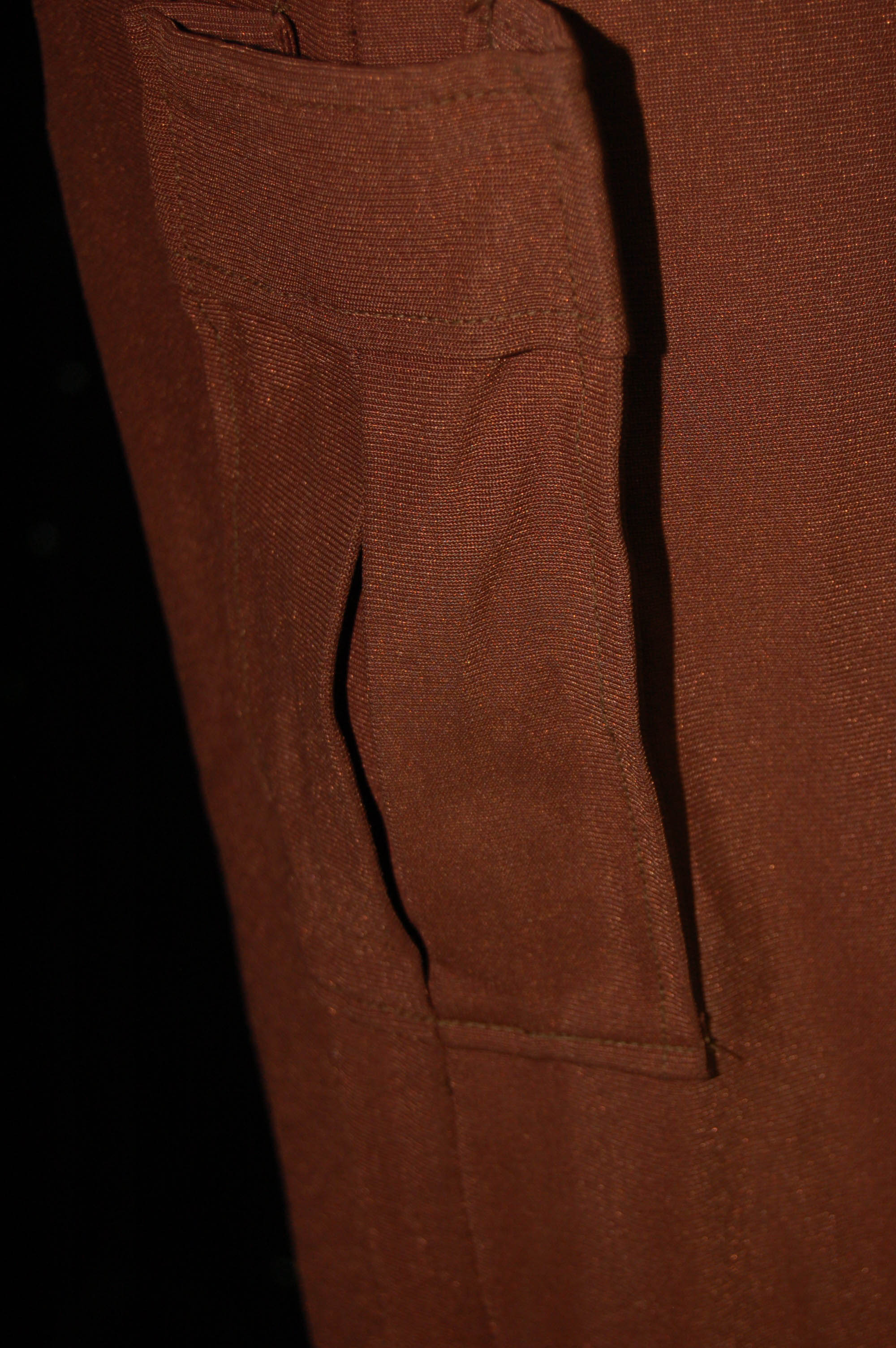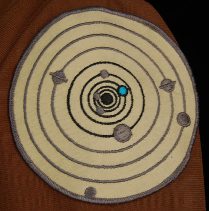 Description: A costume featured in Star Trek I: The Motion Picture, a brown Starfleet Class-D jumpsuit with attached shoulder division strips colored orange, an affixed Earthbase shoulder patch on the left sleeve depicting the solar system and the planets orbits, and an attached plastic bio-monitor. The costume is intended for male actors.