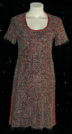 Description: This miscellaneous adult costume lot is from the Star Trek: Deep Space Nine episode “Children of Time” in which the crew of the U.S.S. Defiant discovered a planet where their own descendants were living and that in two days they were going to crash two hundred years in the past. The costume lot includes a brown short sleeved jumpsuit with a zip up the front, two multicolored woven tunics, a woolen mustard colored robe and a woolen rust color top with blue trim. The sewn in tags indicate these costumes were also used during the Star Trek: Voyager series.