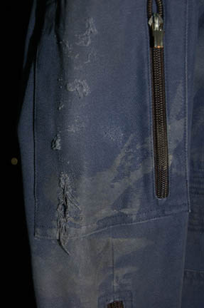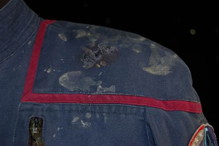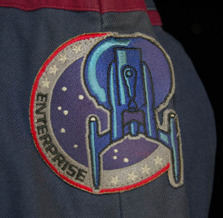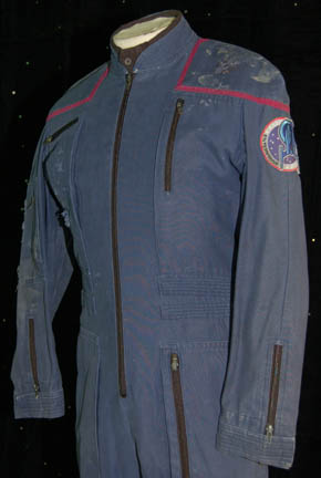 Description: A Starfleet uniform jumpsuit including the famous ‘Enterprise NX-01' left shoulder patch with engineering red division trim around the shoulders. “Enterprise” costumes feature multiple zippered pockets, Velcro size adjustments and zippers at the wrists and ankles, come with detachable shoulder pads, and a black, button up long sleeved undershirt. The uniform is distressed in that it features a degree of rips, tears, and thrashing across the chest, the upper arms, and a tear on the left shoulder above the division color, but in the front of the uniform. The costume also features a degree of dried special effects goop on the shoulders. The sewn in Enterprise tag indicates wear by various actors.