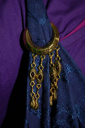 Description: A costume featured in the Star Trek: Enterprise episode "Cold Front" where a member of "Captain Archer's" (Scott Bakula) crew reveals to him that he is actually from the 31th century and is pursuing a Suliban by the name of "Silik" (John Fleck). The costume is for wear by pilgrims seen in the episode and is a purple robe, magenta under-robe sewn in, a blue sash with flowery brocade, a gold-colored clasp, and corresponding pants. A sewn in tag reads 'Enterprise, J. B, Williams #011' and the costumer's tag reads 'Enterprise #011, Cold Front, N. D. Pilgrims, J. B. Williams'.