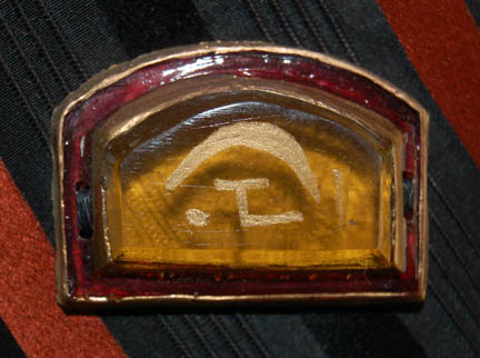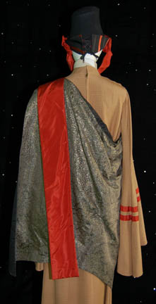 Description: A Vulcan costume composed of a tan robe with orange trim and stripes on the bell shaped sleeves, with a gold colored drape that has orange trim and a large resin badge with Vulcan lettering painted in gold. The costume also comes with an unattached similar resin badge and a black felt hat with red and black accents and a resin badge like the others.