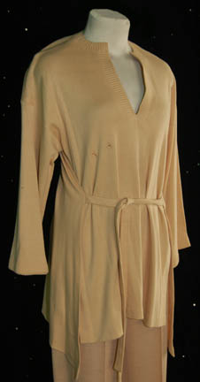 Description: A costume featured in Star Trek I: The Motion Picture, tan colored trousers and a matching long sleeved shirt with a waist tie and a ribbed v-neck, the item features a Western Costume Co. tag and is intended for female actors.