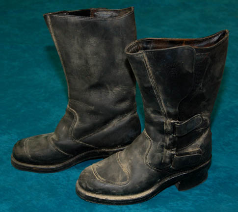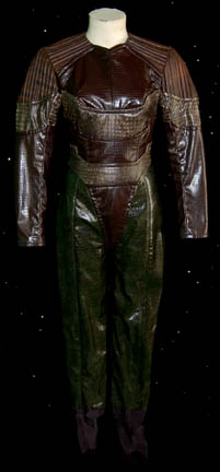 Description: A costume featured in several episodes of Star Trek: Enterprise, "Proving Ground" and "Babel One" and "United", for the Andorian character "Lieutenant Talas" (Molly Brink), First Officer to "Shran" (Jeffrey Combs) aboard the Andorian Imperial Guard ship "Kumari". The costume is a long sleeved blue undershirt, a full length jumpsuit half spandex type material and half green snakeskin pattern vinyl, brown striped vinyl jacket with the snakeskin and textured patterns with zippers on the cuffs and down the back, and distressed black leather boots. A matching scanner pouch is also included. A sewn in tag reads 'Enterprise, Molly Brinks, #065' and the costumer's tag reads 'Enterprise #65, Talas (Andorian), Molly Brinks, Multiple episodes'.