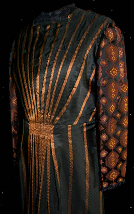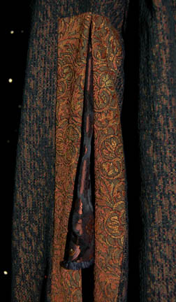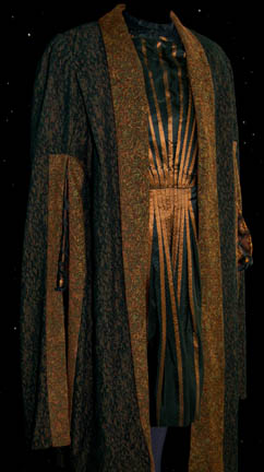 Description: A costume featured in the Star Trek: Enterprise episode "Civilization", where “Enterprise NX-01” finds a fully-inhabited Earth-like planet with some of the inhabitants suffering from a mysterious disease, for Wade Williams in the role of "Garos", a Malurian who was poisoning the water supply with his covert mining operations. The costume is black under robe with a textured copper colored pattern, geometric pattern on the sleeves, lace at the collar and wrists, an over robe of black multi-color, an orange flower pattern along the collar and sleeve, and spandex type pants of an overall design. A sewn in tag reads 'Enterprise, Wade Williams, #009' and the costumer's tag reads 'Enterprise #009 Civilization, Garos, Wade Williams'.