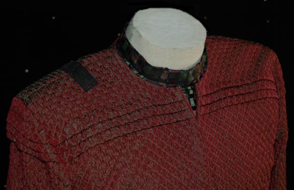 Description: A costume featured on the Star Trek: Enterprise episode "Precious Cargo", where “Enterprise NX-01” rescues a cargo ship with a woman named "Kaitaama" (Padma Lakshmi) in stasis and "Chief Engineer Charles 'Trip' Tucker" accidentally opens her stasis cell, for Mast Alexander in the role of one of Kaitaama's guards. The costume iridescent maroon long sleeved jacket with a diamond shaped pattern, a multi-colored dickie, zipper down the front, and corresponding trousers with stirrups for the feet. A sewn in tag reads 'Enterprise, Mast Alexander'.