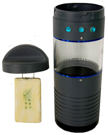 Description: One “Kemocite” container used in the Star Trek: Enterprise episode “The Shipment”. The item is a gray plastic cylinder with a black bottom, with a clear plastic ‘window' topped by another section of gray plastic upon which screws on a matching gray lid. The ‘window’ reveals a white wafer attached to the screw on lid by a clear plastic feature used to give the wafer a freestanding the appearance. The wafer itself is white cast resin with “Xindi” character graphics etched into it, then colored with a greenish stain to make them more apparent. The exterior of the container also features three translucent rubber half-beads details and a black ‘button’ on the lid top on one side of the raised twisting grip. The item measures 10 X 3.5 diameter inches.