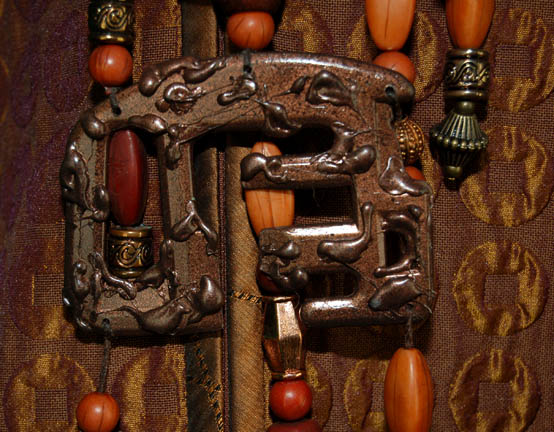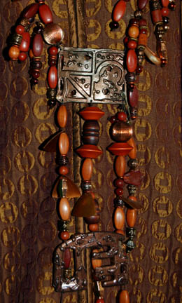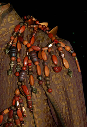 Description: A costume featured on the Star Trek: Enterprise episode "Vox Sola" where a symbiotic alien stows away and captures several of "Enterprise NX-01's". The situation is resolved by locating the alien ship from which the entity came, the Kreetassans. The costume is a long sleeved brown shirt with an iridescent gold checkered pattern and turtle neck, copper colored iridescent pants, and leather shoes. The robe is also a brownish iridescent color with an intricate circular pattern and amazing wood, metal, resin, and plastic beadwork of all shapes and sizes sewn onto the right shoulder that hangs down the front and back and there is an extra string of beads to hang around the neck. A sewn in tag reads 'Enterprise, Louis Ortiz' and the costumer's tag reads 'Enterprise #022, The Needs of the One (working title at the time), n.d. kreetassan, Louis Ortiz'.