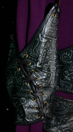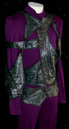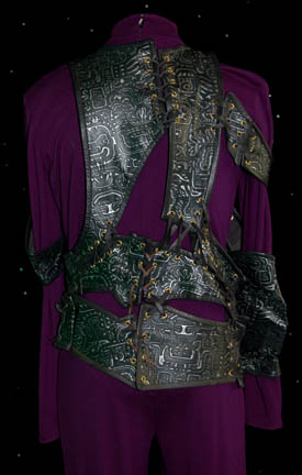 Description: “Durg” (Christopher Collins) was a Markalian mercenary sent to Deep Space 9 with two Bajoran assistants to intercept and steal a shipment of deuridium in the Star Trek: Deep Space Nine episode “The Passenger”. The costume includes a purple jumpsuit with a zip up the back and a black leather harness with covered with silver hieroglyphics. The harness is in irregularly shaped pieces laces together with strips of leather. Costume comes complete with costume tag. The sewn in tag indicates this costume was also used during the Star Trek: The Next Generation series.
