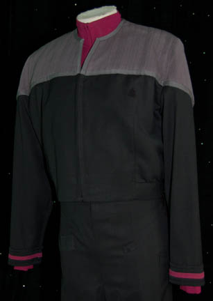 Description: A Starfleet uniform featured in various episodes of Star Trek: Deep Space Nine for wear by Avery Brooks in his portrayal of “Captain Sisko”. The costume is black overall style trousers with straps over the shoulder buttoning to the front, a command red undershirt with Velcro undercarriage and a black uniform jacket with quilted gray shoulders and a zip front. The garments all feature sewn in Deep Space Nine tags reading ‘Avery Brooks'.