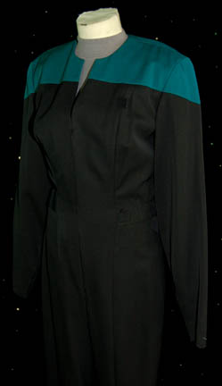 Description: A costume featured in Star Trek: Deep Space Nine for wear by “Jadzia Dax” (Terry Farrel). The costume is a black Starfleet uniform jumpsuit with sciences blue division shoulders and a gray long sleeved undershirt. The jumpsuit features a form fitting elastic waist with sewn in ‘away team' gear loops. The costumer’s tag reads ‘DS9 DAX, Terry Farrell’ and the sewn in tag in the undershirt reads ‘TF’ while the one in the jumpsuit reads ‘Terry Reh Farrell’.