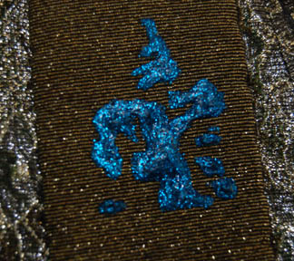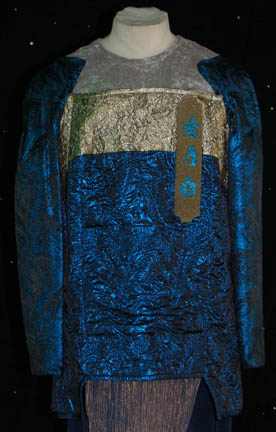 Description: A costume featured in the Star Trek: Deep Space Nine episode “Move Along Home” for wear by “Falow” (Joel Brooks), leader of an alien contingent visiting the station who began a game with “Quark” (Armin Shimerman) that took a very real turn for some of the station crew. The costume is a metallic blue jacket with sparkling gold colored fabric on the chest, silver colored neck and shoulders, a navy colored jumpsuit with affixed to the jacket, and a silver-blue iridescent apron. The chest of the jacket features a gold colored fabric badge with metallic blue alien lettering. The costumer's tag reads ‘410 DS9 “Sore Losers”, FALOW, Joel Brooks’ and indicates the components. “Sore Losers” was the title of the episode before it was adapted to “Move Along Home”.