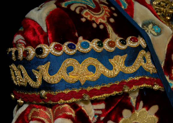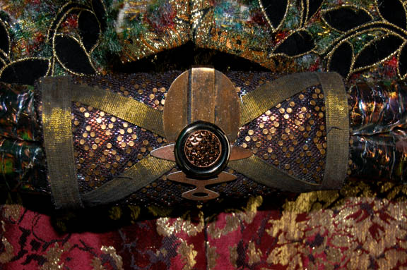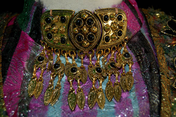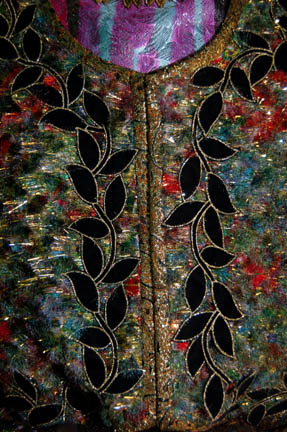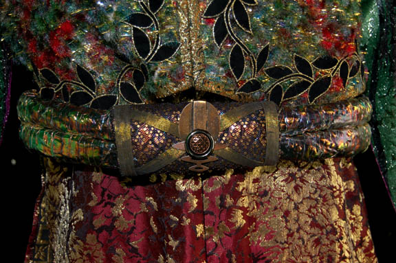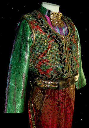 Description: The Grand Proxy is a high ranking official of the Ferengi Allience who is appointed by the Grand NAgus to deal with matters he doesn't wish to deal with in person. In the Star Trek: Voyager episode, “False Profits”, “Neelix” (Ethan Phillips) disguised himself as the Grand Proxy in order to convince the Ferengis “Arridor” (Dan Shor) and “Kol” (Leslie Jordan) to relinquish their hold on the Takarian homeworld of Takar II. This incredible costume includes a sleeveless hot pink jumpsuit with a gold and black floral print, a black top section and detailed Ferengi style wings down the side of each leg; A cropped purple, green, black and pink top with a silver floral design and an impressive gold colored metal ornament at the neck; A multicolored furry waistcoat with gold strands and a black and gold leaf pattern trim. The phenomenal overcoat is red faux fur fabric combined with off-white diamond shapes, woven flowers and faux multicolored jewels around the collar and cuffs. A gold colored metal ornament with faux jewels conceals the Velcro fastener at the front. The inner lining of the coat is red and gold. An impressive iridescent and tubular padded belt is included with a metal decorative center piece. The sewn in tags read “Voyager – Ethan Phillips”. Costume comes complete with costume tag.