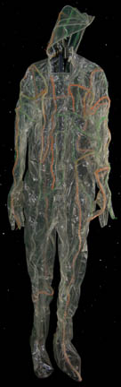 Description: “Species 6339” were a race almost completely assimilated by the Borg and were featured in the Star Trek: Voyager episode “Infinite Regress” in which they introduced an artificial pathogen that attacked the Borg's vinculum. The costume includes two jumpsuits. The first jumpsuit is gray with a small squared pattern and rubber components on the right shoulder, across the chest and left side of the body. The components are black with red stripes and feature numerous multicolored LED lights. Worn over it is a secondary jumpsuit made of lightweight clear plastic with green, orange and clear wires sewn in over its entirety. It has built in feet and gloves and a zip up the back. A clear wired cowl is also included. Due to time and use the plastic jumpsuit is ripping in several places and the electronics on both jumpsuits no longer appear to work.