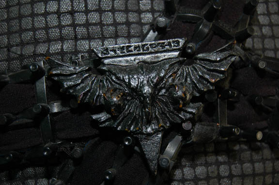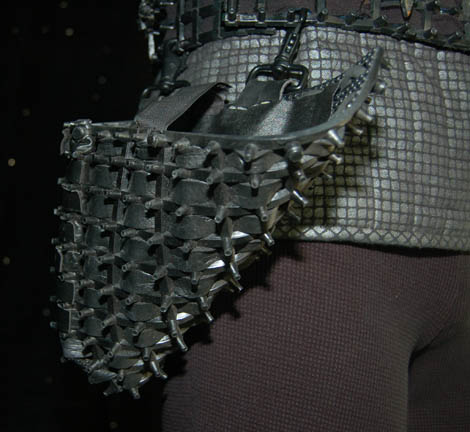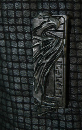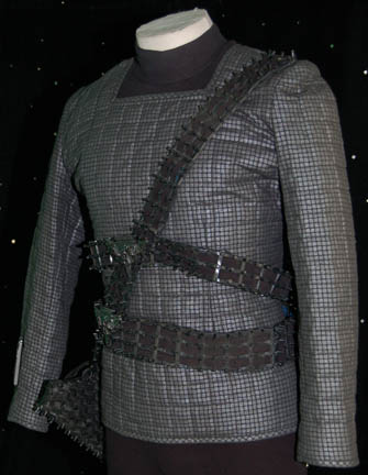 Description: A Romulan Tal Shiar uniform featured in the Star Trek: Deep Space Nine episode “The Die is Cast” during which a large joint Romulan-Cardassian task force put together by their representative intelligence agencies went into the Gamma Quadrant and attempted to cripple the Dominion by eliminating the Founder's home world. The task force was led by “Colonel Lovok” (Leland Orser), a Romulan Tal Shiar operative who later turned out to be a Founder, he wore this costume, a black thermal jumpsuit and a quilted silver square patterned jacket with a zip up the right side front, squared off shoulders and neckline, and a Velcro placement for an accompanying resin Tal Shiar badge on the right sleeve. The badge appears as a metallic silver painted bird of prey swooping across the sky with Romulan lettering etched in under the wing. Also, the costume features a belt-harness made from ‘Dry-deck’ with four attached resin Romulan Empire badges wired on, two on the front, two on the back, and a formed Romulan disruptor pistol holster. The costume jacket features a sewn in Deep Space Nine tag reading ‘Leland Orser’ as well as several other tags indicating use on Star Trek: Voyager as well, the thermal jumpsuit features similar tags indicating use by various other actors and series.