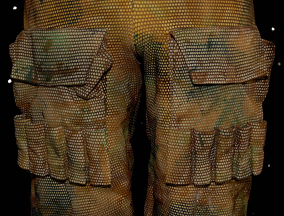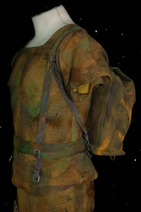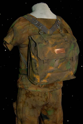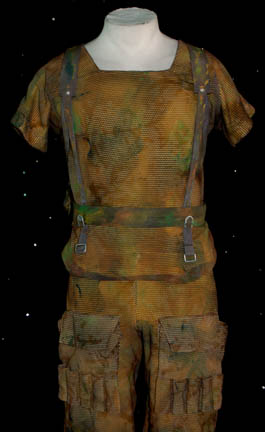 Description: The Vori are a humanoid species at war with the Kradin over the occupation of a planet and featured in the Star Trek: Voyager episode “Nemesis”. This costume was worn by the Vori “Namon” (Nathan Anderson) who was a character in a Vori mind-altering simulation used to brainwash “Chakotay” (Robert Beltran). The short sleeved top is combat fatigues with a painted mesh top layer. The matching trousers have two deep pockets on the front and numerous loops for equipment to attach. A belt is also included along with a camouflage painted backpack. The backpack has shoulder straps and a copper color application on the front. Costume comes complete with costume tag.