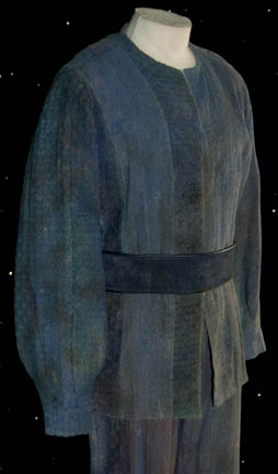 Description: The Dream Species are a Delta Quadrant race featured in the Star Trek: Voyager episode, “Waking Moments” in which they infiltrated the U.S.S. Voyager crews' dreams giving them horrific nightmares in a collective dream. They did this to try and trap the U.S.S. Voyager however “Chakotay” (Robert Beltran) had advanced control over his dreams. He was able to locate the aliens in their cave and dismantle the technology used to transmit their dream attacks. This Dream Species costume includes a mottled fabric blue jacket with knitted stripes down the left side and a zip up the front. Blue knitted squares are incorporated into the design. The corresponding trousers are also blue with knitted stripes down the left side. A blue suede belt is also included. Costume comes complete with costume tag.