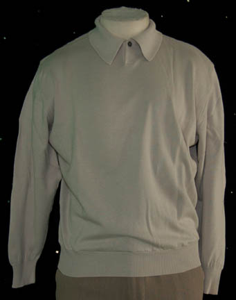 Description: A costume featured in the Star Trek: Deep Space Nine episode “Badda-Bing Badda-Bang” for wear by James Darren in his portrayal of everyone's favorite holographic Las Vegas crooner, “Vic Fontaine”. The costume is a 1960’s style outfit comprised of gray trousers and an off white shirt with matching socks, one extra pair that still features intact brand packaging from ‘Perry Ellis’, and brown slip on shoes. The shirt features form fitting elastic in the cuffs, waist, and collar. The costumer’s tag reads ‘DS9 #566, Vic, James Darren’ and indicates the components.