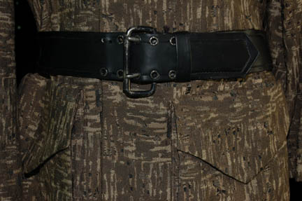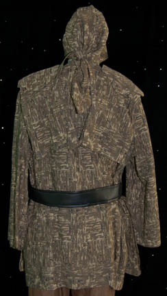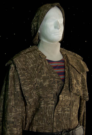 Description: A costume featured in Star Trek: Deep Space Nine for wear by stunt performers portraying “Worf”. The costume is brown trousers with a multicolored striped short sleeved shirt a patterned coat with enormous pockets and a matching hat, and a pair of brown leather boots that feature Velcro seals on the inside and a wide black leather belt. The costumer's tag reads ‘#503 DS9 “Trials and Tribble-ations”, Stunt Worf, Brennan Dyson, Match to Michael Dorn’.