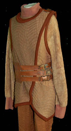 Description: A costume featured in the Star Trek: The Next Generation episode “Brothers” wherein “Commander Data's” (Brent Spiner) creator summons him to the planet his lab is on to give him a gift but Data’s brother “Lore” (Brent Spiner) shows up and steals it. The costume is a long-sleeved, tan, woven shirt with red collar and sleeves, brown, overall style, textured trousers, zip and buckled cuff adjustment, and a brown vest, a buckle on the left side of the collar, reddish piping one the edges and tri-belt around the waist. The costumer’s tag reads ‘#177 TNG Brothers, Lore Dbl, Dana Vitatoe’.
