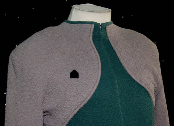 Description: A costume featured in various episodes of Star Trek: Deep Space Nine for wear by Max Grodenchik in his portrayal of “Rom”. The costume is a Bajoran worker's uniform and is composed of a form fitting green jumpsuit with gray sleeves with a matching Ferengi head wrap with a black Velcro placement on the right breast for a Bajoran combadge (sold separately). The costume comes with green painted boots which were not part of the lot when it was located. The sewn on Deep Space Nine tag on the head wrap reads ‘Max’ while the one in the jumpsuit reads ‘Max Grodenchik’.