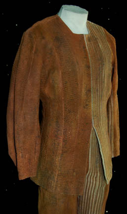Description: The Dream Species are a Delta Quadrent race featured in the Star Trek: Voyager episode, “Waking Moments” in which they infiltrated the U.S.S. Voyager crews' dreams giving them horrific nightmares in a collective dream. They did this to try and trap the U.S.S. Voyager however “Chakotay” (Robert Beltran) had advanced control over his dreams. He was able to locate the aliens in their cave and dismantle the technology used to transmit their dream attacks. This Dream Species costume includes a mottled fabric brown and tan jacket with stripes down the left side and a zip up the front. Diamond, striped and chevron patterns are incorporated into the design. The corresponding trousers are also brown and tan with stripes down the left side. Costume comes complete with costume tag.