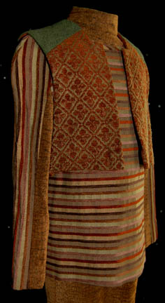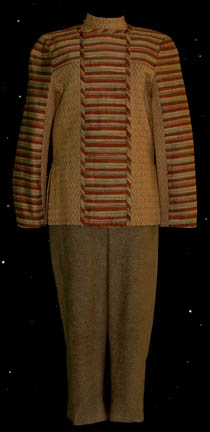 Description: “Brax” (Ian Meltzer) was a Talaxian boy and the only son of “Dexa” (Julianne Christie). He was featured in the Star Trek: Voyager episode, “Homestead” in which he, his mother and five hundred other Talaxians had taken refuge on an asteroid they'd turned into their home. “Neelix” (Ethan Phillips) crash landed on the asteroid and was tended to by Dexa. He befriended the pair and later became Brax’s step-father. This costume collection includes a brown striped top, brown trousers and a brown and tan diamond patterned waistcoat. The waistcoat also has green shoulders. A brown top with earth-tone stripes down each sleeve, across the shoulders and paneled down the front and back. A matching dickie is worn underneath. The accompanying trousers are brown. The last top is pale earth-tone colors in a rectangular blocked pattern. A matching dickie is also included. Costumes come complete with costume tags.