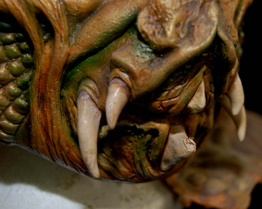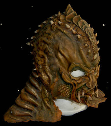 Description: This impressive alien head mask was made for the Star Trek: Voyager episode “Latent Image” in which the alien launched an unprovoked attack on a U.S.S. Voyager shuttle. The mask is made of latex painted in shades of brown and gold to simulate skin detail. There are four resin tusks around the mouth while the other tusks and spikes are made of latex. Due to time and use there is a small tear across the nose and back of the head. There are splits up each side of the face to allow the actor's head to fit into the mask.
