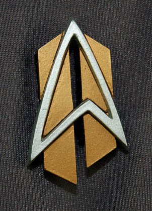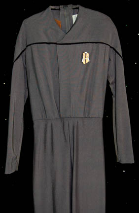 Description: An impressive futuristic gray Starfleet jumpsuit with black trim around the shoulders. There is a zip up the back, an adjustable internal waistband and a small Velcro patch on the left side of the chest for a Combadge to attach. The accompanying Combadge is in the alternate timeline style and made of resin painted gold and silver. This style of costume was featured in episodes that involved alternate timelines such as Star Trek: Voyager, “Endgame”. Costume comes complete with costume tag.