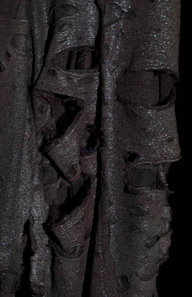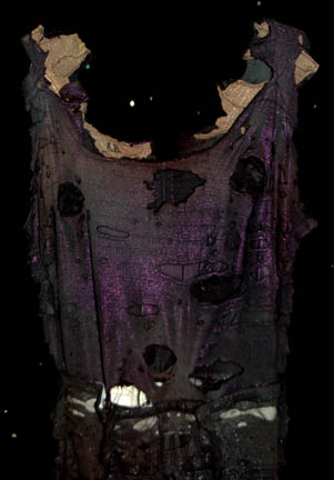 Description: A costume featured in several episodes of Star Trek: Enterprise where “Enterprise NX-01” crew are trying to find and stop a renegade band of “Augments” created by “Arik Soong” (Brent Spiner). The costume is for wear by Abby Brammel in the role of the augment “Persis” and is a full-length sleeveless jumpsuit in an iridescent purple shade with a zipper up the back and stirrups for the feet. The costume has various rips and tears to portray the amount of distress these augments have endured and includes equally distressed knee-high leather boots. A costumer's tag reads ‘Enterprise #080-082, Female Augments’.