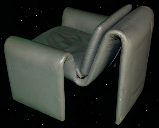 Description: A chair featured in various episodes of Star Trek: Enterprise appearing in the crew quarters of “Commander Tucker” (Connor Trinneer) on the “Enterprise NX-01”. The chair is grey vinyl with a folded appearance to its legs and back with a Velcro placement for the seat and back cushions to stay in place. The item features a tag on the underside inscribed ‘STV' indicating likely use in various episodes of Star Trek: Voyager as well. Item measures approx. 33.5 X 35 X 27 inches.