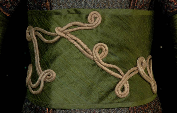Description: A costume featured in the Star Trek: Deep Space Nine episode “For the Cause” for wear by Tracy Middendorf in the role of “Tora Ziyal”, the half Bajoran/Half Cardassian daughter of “Gul Dukat” (Mark Alaimo) and one of the Bajoran women under his “care” during the Occupation, and is a full-length olive/black dress featuring a metallic copper colored texture sewn onto it up the back, over the shoulders, sleeves, and down the front, metallic brown piping, short sleeves with longer, lighter green colored sleeves sewn in to give the appearance of a separate garment, a neoprene lining, olive colored leggings, a waist cincher in a corresponding color to the long sleeves, an olive colored, textured design upon it. A sewn in tag reads ‘Deep Space Nine, Tracy Middendorf' and the costumer’s tag reads ‘DS9 494 For the Cause, Ziyal, Tracy Middendorf’.