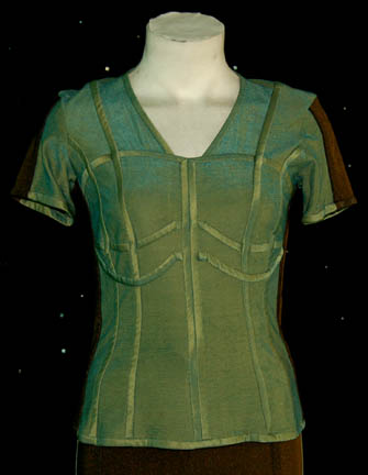 Description: “Derran Tal” (Musetta Vander) was a Varro female featured in the Star Trek: Voyager episode “The Disease” in which she became romantically involved with “Harry Kim” (Garrett Wang). They were forced to break of their romance due to the rules of the ship. Her costume lot includes two short sleeved green fitted tops with ribbing on the front and back. There is brown trim down each side and down the shoulders. The single corresponding trousers are brown with green trim down the sides and have built-in feet. Costume comes complete with costume tag.