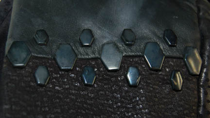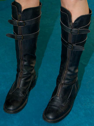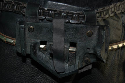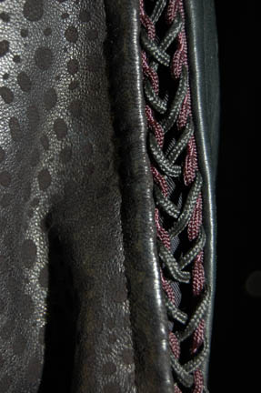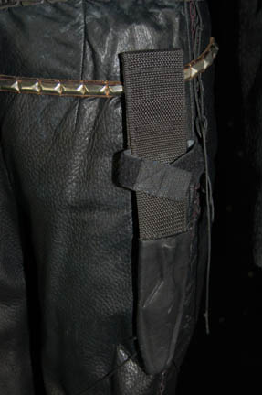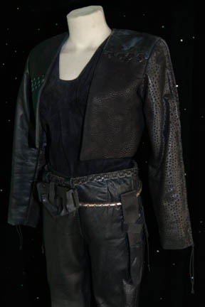 Description: A costume featured in the Star Trek: DS9 Star Trek: DS9 episode “The Emperors New Cloak” for wear by Nichole De Boer during her portrayal of “Ezri Dax”. The costume is black leather trousers with braided string accents down the outside seams, a short sleeved suede shirt, and a cropped black leather jacket with faux reptile skin pattern. The costume also comes with black leather zip front boots, a leather belt with metal studs affixed all around and a black nylon sheath with black leather accents, and a second belt made from black leather strips woven to appear as chain link with a molded resin holster. The costume pieces feature affixed Deep Space Nine tags reading ‘Nichole De Boer' and the costumer’s tag reads ‘#562 DS9, Emperor’s New Cloak, Ezri Dax, Nichole De Boer’ and lists the components.