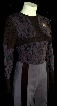 Description: A costume featured in the Star Trek: Deep Space Nine episode “The Abandoned”, wherein “Quark” (Armin Shimerman) finds an infant Jem'Hadar stasis pod with some salvage he had procured. The costume is for wear by Bumper Robinson in the role of the soon teenage Jem’Hadar and is a full-length, long-sleeved jumpsuit featuring a purple and black swirling pattern in panels separated by accents of black, wrinkled fabric, zip cuff adjustment, a metal colored port on left side of the chest for the “ketracel-white” dispenser (included but broken) that “Dr. Bashir” (Alexander Siddig) made for him, attached trousers of a gun metal gray color with a black stripe and stirrups for the feet. Lot includes a complete second jumpsuit minus the metal colored port for the ketracel-white dispenser. A sewn in tag reads ‘Deep Sp ace Nine, Bumper Robinson’.