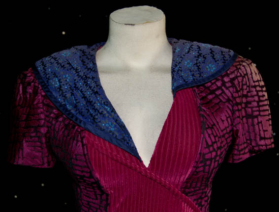Description: A costume featured in the Star Trek: Deep Space Nine episode “The Ship”, wherein “Captain Sisko” (Avery Brooks) fights a group of Jem'Hadar to keep the wreckage of a crashed Dominion ship after the crew still on his ship are killed save only a few. The costume is for wear by Kaitlin Tompkins in the role of the Vorta in charge of the Jem’Hadar,“Kilana”, and is a cranberry colored blouse and skirt with a corduroy design on the abdomen, an uneven, pleated, floral pattern in several shades of blue on the collar, a purple and black brickwork pattern of randomly shaped/sized objects along the shoulders and down the sides, a faux jewel where the corduroy portions overlaps on the purple/black, a pair of trousers that correspond in style and color to the corduroy portion of the blouse, stirrups for the feet, and a pair of gold colored metal earrings. There is light wear on the shoulders due to time and storage. A sewn in tag reads ‘Deep Space Nine, Kaitlin Hopkins’ and the costumer’s tag reads ‘Ds9, Kilana (Vorta), Kaitlin Hopkins’.