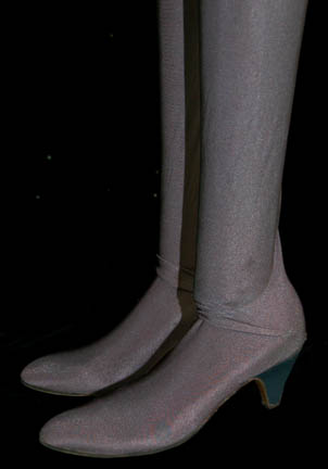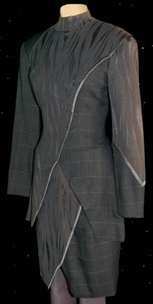Description: A costume featured in the Star Trek: DS9 episode “Through the Looking Glass” for wear by Felicia Bell in her portrayal of “Jennifer Sisko”, wife to the Mirror Universe “Ben Sisko” (Avery Brooks). The costume is a 2 piece jacket and skirt, both of gray wool with gray brocade, and a pair of matching heel shoes. The costumer's tag reads ‘466 DS9 “Through the Looking Glass”, Jennifer, Felicia Bell’ and indicates the components. A slight degree of fading is present on the sleeves due to storage conditions.