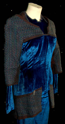 Description: A costume featured in the Star trek: Deep Space Nine episode “Tribunal”, wherein “Chief O'Brien” (Colm Meaney) is put on trial in a Cardassian court where guilt is assured in every case. The costume is for wear by Caroline Lagerfelt in the role of the Cardassian Archon “Makbar” and is a royal blue, velvet, long sleeved, full-length jumpsuit with a multicolored, dotted piping, epaulettes of a red and black checkerboard design, zip down the back and stirrups for the feet, a corresponding, jacket/tunic but with the royal blue velvet as only a panel across the abdomen, the multicolored, dotted design across the bottom, along the collar and down the sleeves, and the checkerboard pattern as a piping. The costumer’s tag reads ‘DS9 445 Tribunal, Makbar, Caroline Lagerfelt, Cardassian’.