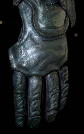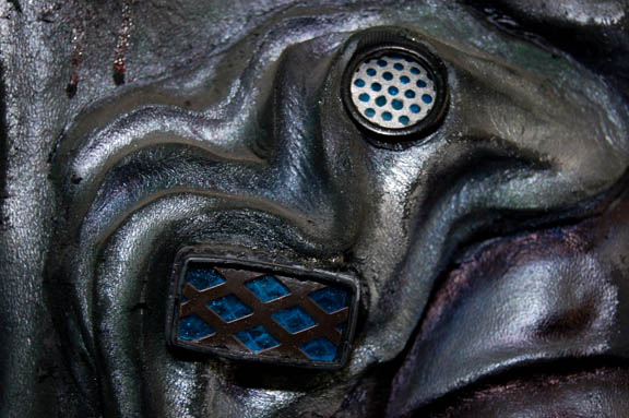 Description: The Hirogens are a strong nomadic race of hunters featured in multiple Star Trek: Voyager episodes including “Message in a Bottle” and “Hunters”. A black full length cast rubber body suit painted with silver details to give it an armored appearance, with matching gloves, and boots. The right breast features a pair of green lights that are molded into the costume and activated by a battery box housed behind the left shoulder, which is hidden under the encasing back mold. This costume would have made appearances in episodes like “Flesh and Blood, Part I” and “Hunters”.
