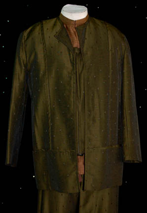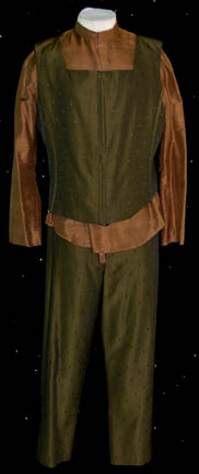 Description: A costume featured in the Star Trek: Deep Space Nine episode “Honor Among Thieves”, wherein “Chief O'Brien” (Colm Meaney) infiltrates the Orion Syndicate to ascertain the identity of the Syndicate’s mole in Starfleet Intelligence. The costume is a long sleeved, olive colored shirt with thin, vertical, black stripes, and a zip up the front; a square cut vest of a darker olive color, little embroidered diamond shapes, threaded accents, and a zip down the front that tucks into the corresponding overall style trousers, and a matching, long-sleeved jacket, two functional pockets, and pleated accent. A sewn in tag reads ‘Deep Space Nine, Colm’ and the costumer’s tag reads ‘DS9 #539, O’Brien, Colm Meaney’.