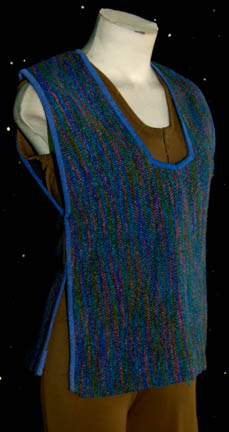 Description: “Karya” (Meghan Murphy) was a Vori child at the center of a Vori brainwashing simulation used on “Lt. Cmdr Chakotay” (Robert Beltran) in the Star Trek: Voyager episode “Nemesis”. The sleeveless jumpsuit is olive-green with a zip up the front. Worn over the jumpsuit is a blue woolen vest with multicolored stripes and blue suede trim. Costume comes complete with costume tag. A secondary sewn in tag indicates this costume was reused during the Star Trek: Enterprise series.