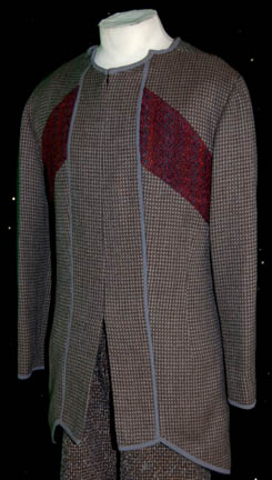 Description: A lot of costumes featured in the Star Trek: Deep Space Nine episode “Duet”, wherein, a Cardassian comes aboard the station whom is suspected of being a infamous Occupation war criminal. The costume is for wear by Harris Yulin as the guilt-ridden, former file clerk “Aamin Marritza” and is a long-sleeved, wool, tweed jacket with a textured, crimson insert, a zip down the front, corresponding wool tweed trousers, and stirrups for the feet. Included in the lot is another identical stunt version of the costume. A sewn in tag in the character costume reads ‘Deep Space Nine, Mr. H. Yulin' and the stunt version reads ‘Deep Space Nine, Woody Porter’.