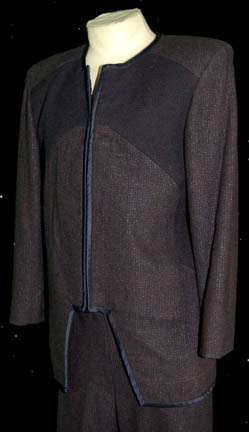 Description: A costume featured in various episodes of Star Trek: Deep Space Nine for wear by Avery Brooks in the role of “Captain Benjamin Sisko” and the Bajoran “Emissary of the Prophets”. The costume is a long sleeved, navy blue jacket with vertical, reflective metallic stripes, a zip down the front that tucks into the corresponding navy blue trousers, and both articles have satin lining. A sewn in tag reads ‘Deep Space Nine, Avery Brooks' and the costumer’s tag reads ‘DS9, Sisko, Avery Brooks’.