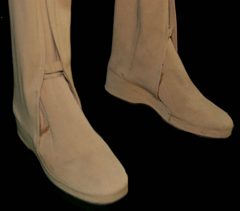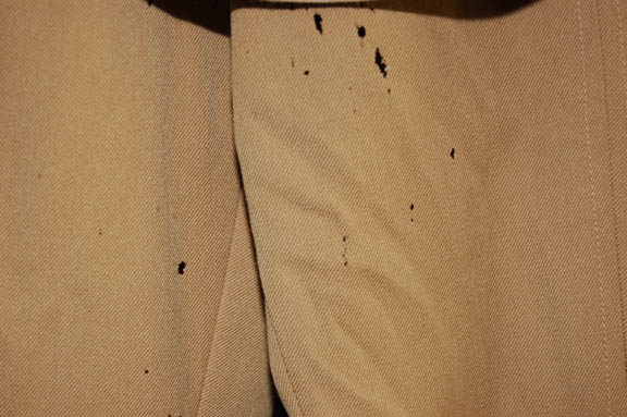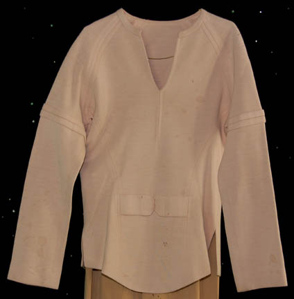 Description: A costume featured in Star Trek I: The Motion Picture for wear by Walter Koenig in his portrayal of “Chekov”. The costume is a tan Class-B Starfleet uniform top with long sleeves, khaki colored trousers with attached shoes, and an unattached plastic bio-monitor. The costume is the style that appeared during the scene involving the ‘V'Ger plasma probe’ immediately before “Chekov” was wounded. The uniform top exhibits some dried stains, while the trousers exhibit evidence of moth damage or special effects spark damage. Both items feature sewn in Western Costume Co. tag reading ‘Walter Koenig’.