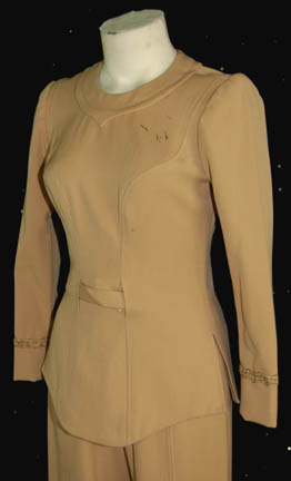 Description: A costume featured in Star Trek I: The Motion Picture. The costume is a tan Class-A uniform top with matching trousers. The top features affixed gold colored trim around the sleeve cuffs indicating the wearer to be the rank of ‘lieutenant', an unattached plastic bio-monitor, and threads remaining from a removed patch on the left breast. The costumer’s tag reads ‘Star Trek, Iva Lane, (Lieut. Tech.), Change #1, sc.64, Int. bridge, sc. 97’.