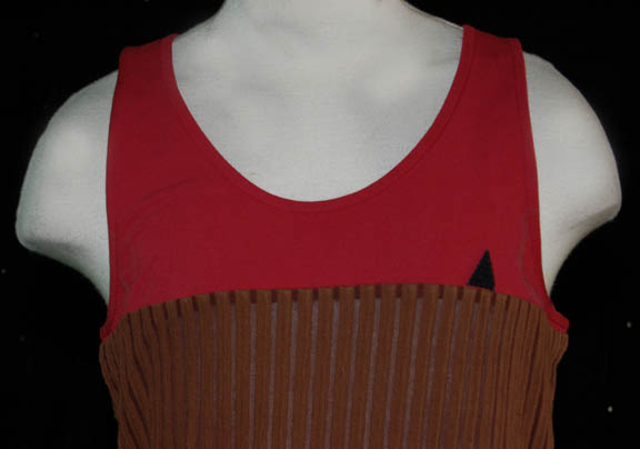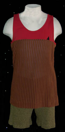 Description: A lot of costume aspects featured in various episodes of Star Trek: Voyager for wear by Garrett Wang in the role of “Ensign Harry Kim”, Operation Officer of the starship “Voyager”. The articles are similar to something that might be worn while exercising and are a red tank top with a brown, ribbed bottom area, olive and black knit shorts, and corresponding shorts with the tank top. A sewn in tag reads ‘Voyager, Garrett Wang'