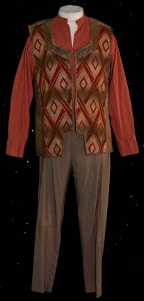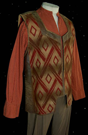 Description: A lot of costume aspects for use in various episodes of Star Trek: Voyager, for wear by Robert Beltran in the role of the former Maquis leader and First Officer of the starship Voyager “Commander Chakotay”. The articles are a long-sleeved rust colored shirt with white suns and circles, and a zip down the front; a long-sleeved, off-white shirt, southwestern design, blue and red stripes, and a zip down the front; a vest with red and white diamond patterns, leather accents, and brown trousers. A sewn in tag reads ‘Voyager, Robert Beltran'.