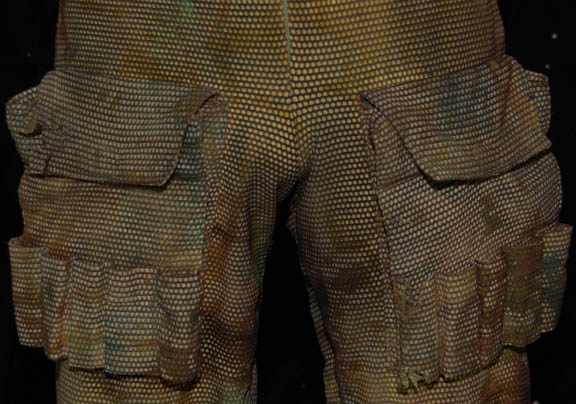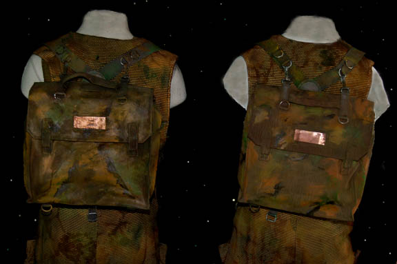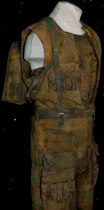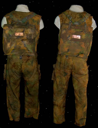Description: A lot of costumes featured in the Star Trek: Voyager episode “Nemesis”, wherein “Commander Chakotay” is taken, brainwashed, and used as a soldier in one race's genocidal war against another. The costume is for wear by Michael Mahonen in the role of the leader of the genocidal Vori who indoctrinated “Chakotay” into their ranks to fight for them, Brone, and is yellow tank top and a camouflaged fishnet tank top sewn on top of it, a matching sleeveless jumpsuit with the same fishnet, two functional pockets, several loops for extra ammunition, a camouflaged belt, a corresponding backpack, and is moderately distressed to appear as something that has been worn for weeks on end outdoors. This lot also includes an identical costume that has been further distressed, or “battle damaged” with various rips and frayed ends but does not include another belt. A sewn in tag reads ‘Voyager, Michael Mahonen’ and the costumer’s tag reads ‘171 Nemesis, Brone, Michael Mahonen’.