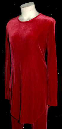 Description: A costume featured in various episodes of Star Trek: Voyager, for wear by Roxann Dawson in the role of the Chief Engineer of the Starship “Voyager”, Lieutenant B'Elanna Torres. The costume is a long-sleeved red velvet tunic with a zip up the back and corresponding trousers. A sewn in tag reads ‘Voyager, Roxan Dawson’.