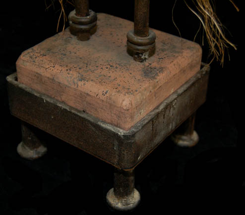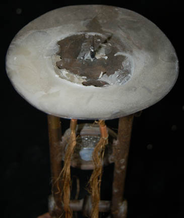 Description: A wedding decoration from “T'Pol’s” (Jolene Blalock) Vulcan childhood home courtyard and featured in the Star Trek: Enterprise episode “Home” in which “T’Pol” engages in an arranged marriage ceremony with her childhood fiancé “Koss” (Michael Burke). The decoration includes a metal base with a resin block inside it and a metal decorative frame. A piece of clear circular acrylic is in the center with two strands of hair like twine hanging down from the top. The circular disk at the top is for a candle (not included) to be attached. Measures approx. 21½ x 5¾ x 5¾ inches.