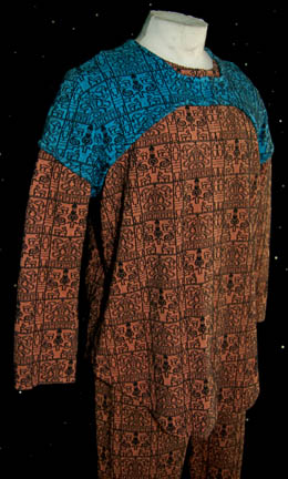 Description: A lot of costume aspects featured in various episodes of Star Trek: Voyager by Ethan Phillips as the Talaxian jack-of-all-trades, “Neelix”. This lot is two copies of a costume; two long-sleeved shirts of a burnt orange and teal color with a textured print that resembles some sort of Central American hieroglyph, a zip up the front, and a pair of corresponding trousers. A sewn in tag reads ‘Voyager, Ethan Phillips' and the costumer’s tag reads ‘John Phillips, Neelix, Voyager’.